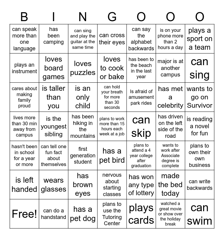 This bingo card has 49 words: made the bed today, major is at another campus, plays cards, is the youngest sibling, is an only child, is reading a novel for fun, has been camping, has a pet dog, is on your phone more than 2 hours a day, has a pet bird, plays a sport on a team, can cross their eyes, has met a celebrity, Is afraid of amusement park rides, wears glasses, has driven on the left side of the road, plays an instrument, can sing, can write backwards, can say the alphabet backwards, has been to the beach in the last year, has been hiking in the mountains, can speak more than one language, loves board games, Free!, loves puzzles, wants to go on Survivor, can do a handstand, can hold your breath for more than 30 seconds, is taller than you, can swim, can skip, is left handed, has brown eyes, lives more than 30 min away from campus, plans to attend a 4 year college after graduation, wants to work after Associate degree is complete, plans to own their own business, cares about making family proud, first generation student, nervous about starting classes, hasn't been in school for a year or more, plans to work more than 15 hours each week at a job, plans to use the Tutoring Center, loves to cook or bake, can sing and play the guitar at the same time, has won any type of lottery, can tell one fun fact about themselves and watched a great movie or show over the holiday break.
