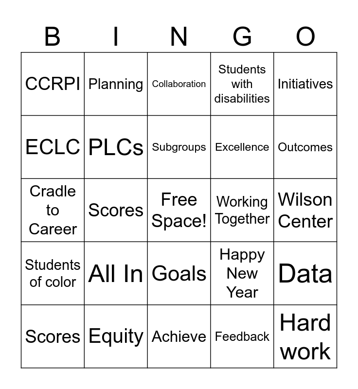 This bingo card has a free space and 24 words: All In, Equity, Subgroups, Scores, Initiatives, CCRPI, ECLC, Planning, Working Together, Goals, Excellence, Cradle to Career, Happy New Year, Data, PLCs, Feedback, Wilson Center, Collaboration, Outcomes, Scores, Hard work, Students of color, Students with disabilities and Achieve.