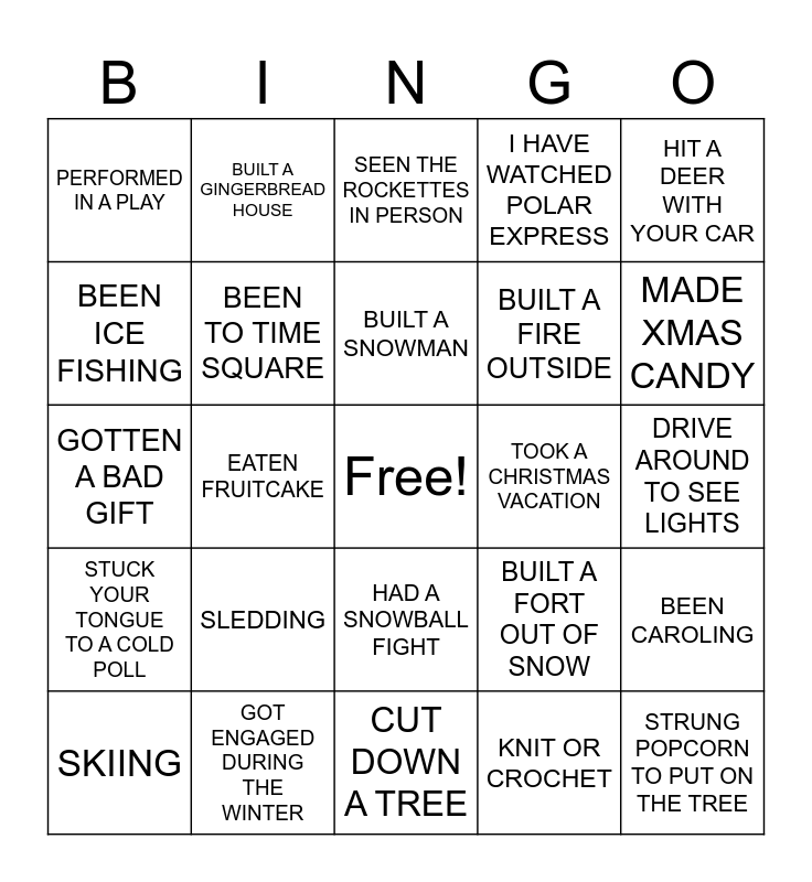 This bingo card has a free space and 29 words: SKIING, HORSE DRAWN CARRIAGE, EATEN FRUITCAKE, ROASTED CHESTNUTS, PERFORMED IN A PLAY, SEEN THE ROCKETTES IN PERSON, BEEN TO TIME SQUARE, SLEDDING, TOOK A CHRISTMAS VACATION, GOT ENGAGED DURING THE WINTER, DRIVE AROUND TO SEE LIGHTS, STRUNG POPCORN TO PUT ON THE TREE, CUT DOWN A TREE, KNIT OR CROCHET, MADE XMAS CANDY, BURNT FOOD DURING THE HOLIDAYS, HAD A SNOWBALL FIGHT, STUCK YOUR TONGUE TO A COLD POLL, HIT A DEER WITH YOUR CAR, GOTTEN A BAD GIFT, BUILT A FORT OUT OF SNOW, I WAS BORN IN THE WINTER, BUILT A FIRE OUTSIDE, BEEN ICE FISHING, I HAVE WATCHED POLAR EXPRESS, BUILT A GINGERBREAD HOUSE, BEEN CAROLING, BUILT A SNOWMAN and I LIKE DEVILED EGGS.