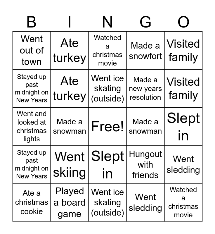 ⚠ This card has duplicate items: Watched the Stranger Things Finale (2), Went to the movie theatre (2), Watched a Christmas movie (2), Ate turkey (2), Went sledding (2), Went skiing (2), Went ice skating (outside) (2), Ate a christmas cookie (2), Visited family (2), Went out of town (2), Made a snowman (2), Made a snowfort (2), Watched a christmas movie (2), Slept in (2), Stayed up past midnight on New Years (2)
