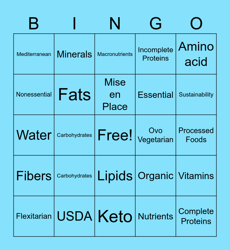 This bingo card has a free space and 32 words: Nutrients, Nutrition, Carbohydrates, Starches, Fibers, Fats, Amino acid, Vitamins, Minerals, Food Allergies, Mise en Place, Macronutrients, Micronutrients, Delivery Services, Ovo Vegetarian, Blue Apron, Flexitarian, Water, Lipids, Carbohydrates, Organic, Whole foods, Processed Foods, USDA, Complete Proteins, Incomplete Proteins, Essential, Nonessential, Mediterranean, Keto, Green Chef and Sustainability.
