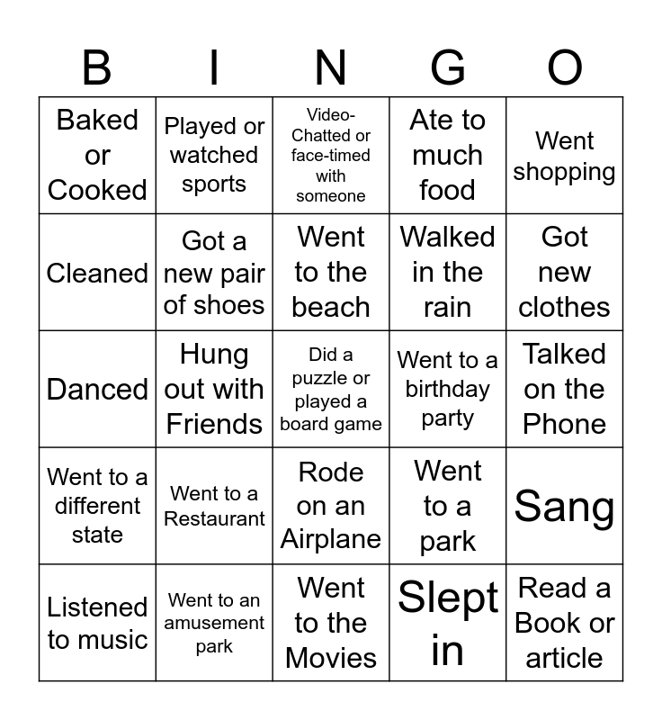 This bingo card has 25 words: Went to a Restaurant, Went to the Movies, Went to the beach, Listened to music, Went shopping, Baked or Cooked, Cleaned, Played or watched sports, Went to a birthday party, Rode on an Airplane, Walked in the rain, Danced, Went to a park, Sang, Got a new pair of shoes, Read a Book or article, Talked on the Phone, Video-Chatted or face-timed with someone, Got new clothes, Hung out with Friends, Did a puzzle or played a board game, Went to an amusement park, Went to a different state, Ate to much food and Slept in.