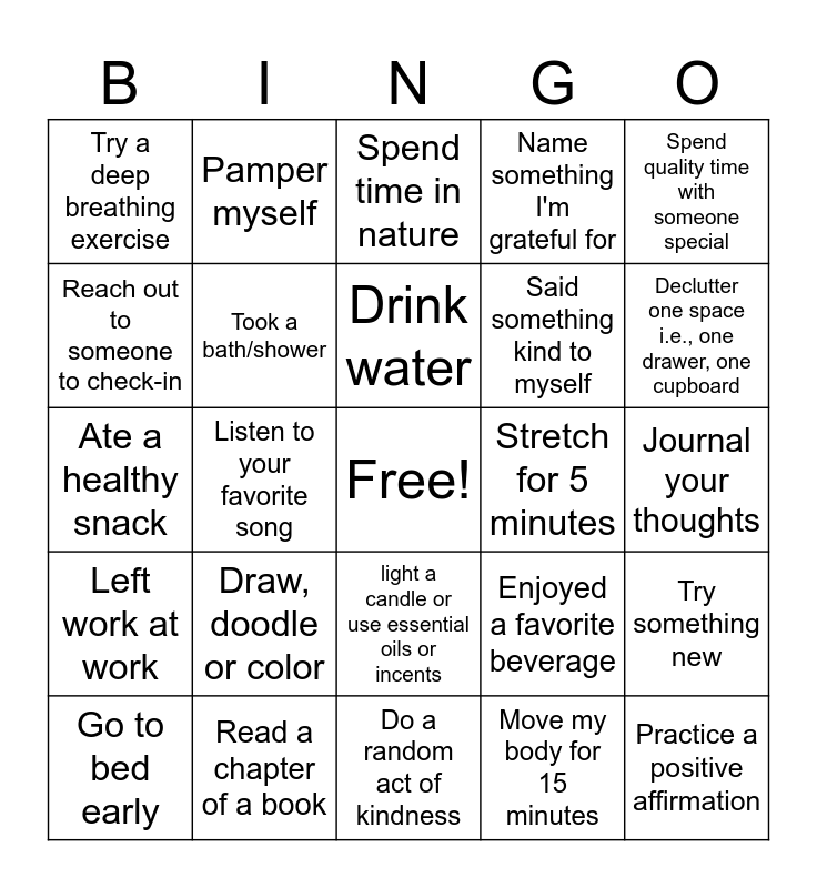 This bingo card has a free space and 29 words: Go to bed early, Meditate for 5 minutes, Listen to your favorite song, Take a nap or rest quietly (no phone), Try a deep breathing exercise, Spend time in nature, Took a bath/shower, Draw, doodle or color, Stretch for 5 minutes, Read a chapter of a book, Journal your thoughts, Practice a positive affirmation, Do a random act of kindness, Move my body for 15 minutes, Declutter one space i.e., one drawer, one cupboard, dance to one of your favorite songs, light a candle or use essential oils or incents, Left work at work, Spend quality time with someone special, Ate a healthy snack, Enjoyed a favorite beverage, Stretched, Said something kind to myself, Reach out to someone to check-in, Name something I'm grateful for, Pamper myself, Try something new, Drink water and Brush and Floss.