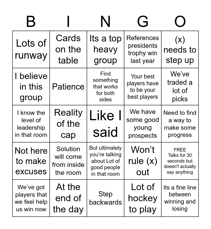This bingo card has 46 words: Irons in the fire, Like I said, It’s a process, Step backwards, Solution will come from inside the room, Due diligence, Cards on the table, Does this player fit, I believe in this group, Well, again, Patience, References presidents trophy win last year, FREE Talks for 30 seconds but doesn't actually say anything, Won’t rule (x) out, Money in money out, Certainly looking at it, Find something that works for both sides, We have some good young prospects, Built for the playoffs, (x) needs to step up, Reality of the cap, Lot of hockey to play, Lots of runway, Your best players have to be your best players, This isn’t fantasy hockey, We’ve traded a lot of picks, We’ve got players that we feel help us win now, Results orientated game, But ultimately you’re talking about Lot of good people in that room, Not here to make excuses, Obviously, Next man up mentality, It’s a tough league, (In reference to youn guys) have to learn how to play the right way, Nothing like the expectations the players put on themselves, At the end of the day, Need to find a way to make some progress, Grind another point out of there, I know thats easy to say, Like to see some consistency, Its a fine line between winning and losing, Its a top heavy group, I know the level of leadership in that room, When you’re the general manager it’s always on your shoulders, Fall into that trap of looking too far ahead and Focusing on hockey deals.
