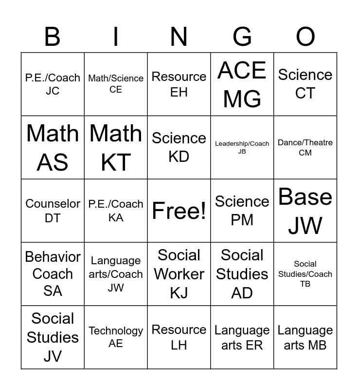 This bingo card has a free space and 53 words: Language arts KB, Language arts MB, Language arts DM, Language arts ER, Language arts/Coach JW, Math BA, Math/Science CE, ESL TL, Math AS, Math GS, Math KT, Social Studies AS, Social Studies/Coach TB, Social Studies AD, Social Studies LT, Social Studies JV, Science KD, Science PM, Science AS, Science CT, P.E./Coach KA, Art AB, Leadership/Coach JB, P.E./Coach JC, Band CC, Technology AE, School Success/Coach CF, Orchestra BG, Technology JH, Dance/Theatre CM, Leadership/Dyslexia JM, Band SP, Careers SS, Choir JS, ACE CC, Co-Teach KD, ACE MG, Resource LH, Resource EH, Resource LL, Resource JS, Resource SS, Base JW, Secretary KB, Liason Officer NG, Social Worker KJ, Counselor DK, Counselor EM, Counselor DT, Behavior Coach SA, CAS AG, Librarian TR and Counselor Clerk CC.