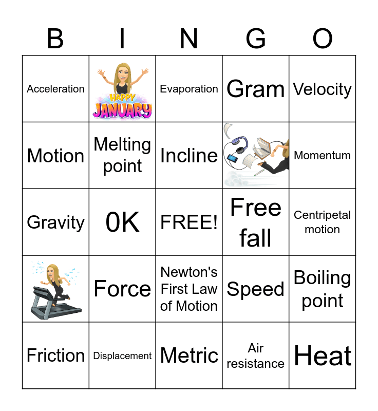 This bingo card has 3 images, a free space and 21 words: Force, Displacement, Incline, Friction, Velocity, Acceleration, Motion, Free fall, Newton's First Law of Motion, Gravity, Speed, Boiling point, Melting point, Air resistance, Centripetal motion, Evaporation, Momentum, 0K, Heat, Gram and Metric.