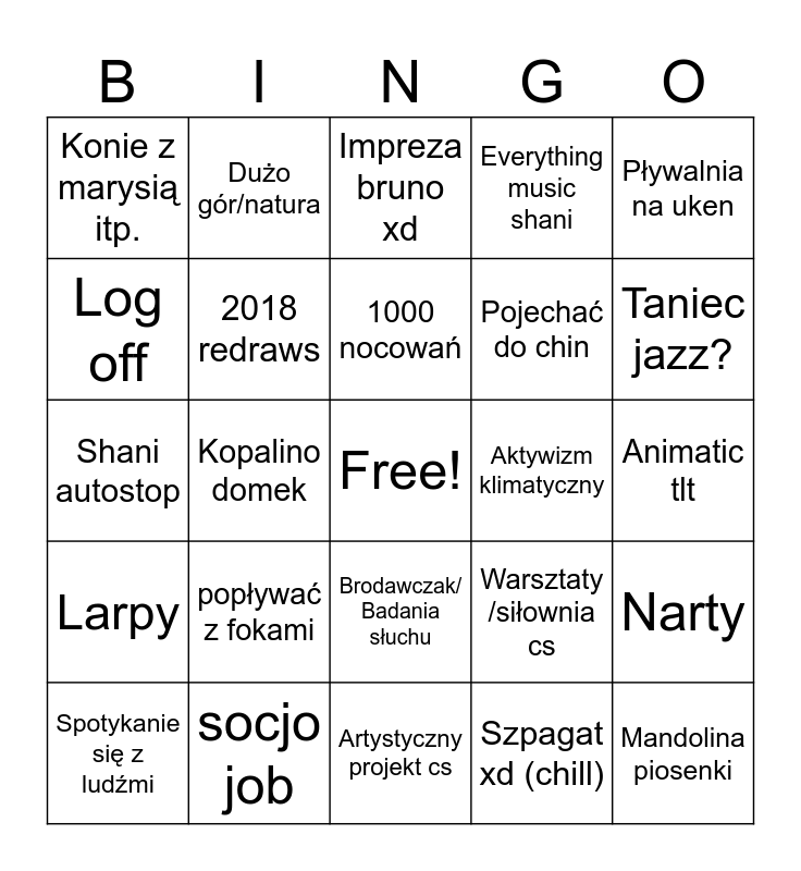 This bingo card has a free space and 24 words: popływać z fokami, socjo job, 1000 nocowań, Spotykanie się z ludźmi, Pływalnia na uken, Konie z marysią itp., Log off, Dużo gór/natura, Aktywizm klimatyczny, Brodawczak/ Badania słuchu, Pojechać do chin, Shani autostop, Warsztaty /siłownia cs, Narty, 2018 redraws, Szpagat xd (chill), Animatic tlt, Impreza bruno xd, Taniec jazz?, Kopalino domek, Mandolina piosenki, Larpy, Everything music shani and Artystyczny projekt cs.