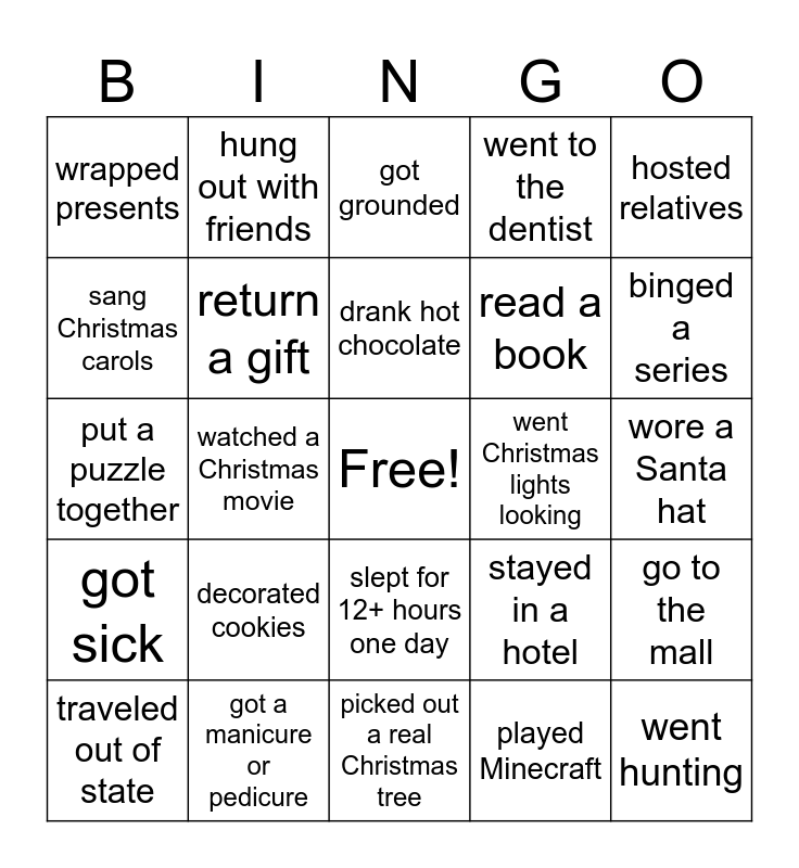 This bingo card has a free space and 25 words: decorated cookies, picked out a real Christmas tree, drank hot chocolate, traveled out of state, hosted relatives, wrapped presents, sang Christmas carols, hung out with friends, went Christmas lights looking, slept for 12+ hours one day, read a book, put a puzzle together, stayed in a hotel, go to the mall, return a gift, walk a dog, wore a Santa hat, got grounded, binged a series, watched a Christmas movie, went hunting, got a manicure or pedicure, got sick, went to the dentist and played Minecraft.
