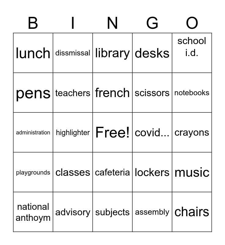 This bingo card has a free space and 44 words: pencil, classes, books, assembly, markers, backpacks, teachers, chrome books, desks, chairs, lunch, advisory, lockers, crayons, assignments, friends, subjects, covid..., Clear the halls, administration, dissmissal, cafeteria, beat the bell, school i.d., stupid phys ed (Surin), art, french, math, music, national anthoym, social studies, library, instruments, students, playgrounds, chalks, erasers, papers, notebooks, pens, highlighter, chalkboards, scissors and glue sticks.