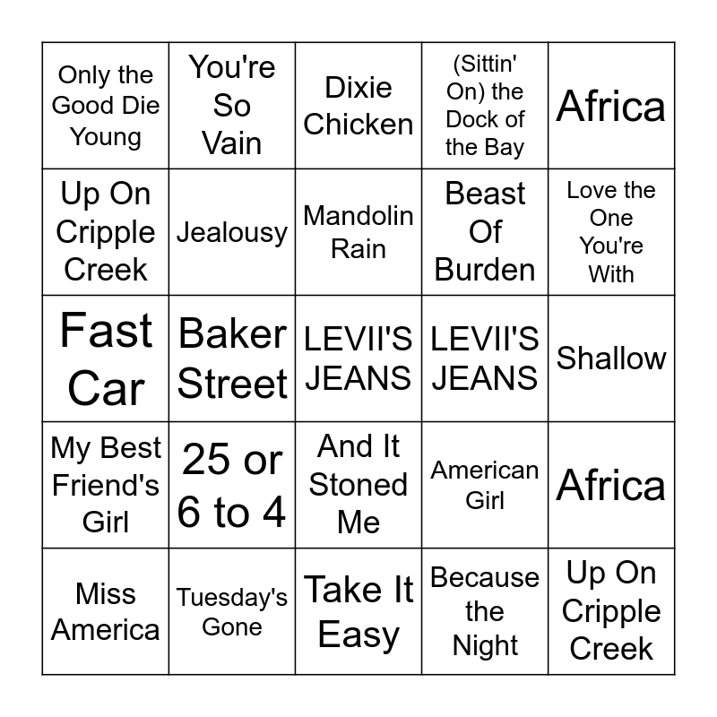 ⚠ This card has duplicate items: You Don't Mess Around with Jim (2), You're So Vain (2), Fast Car (2), Go Your Own Way (2), And It Stoned Me (2), Werewolves of London (2), My Best Friend's Girl (2), Don't Do Me Like That (2), Reelin' In The Years (2), The Joker (2), Train in Vain (Stand by Me) (2), Piece of My Heart (2), Pancho & Lefty (2), I'm Goin' Down (2), My Sweet Lord (2), Because the Night (2), Only the Good Die Young (2), 25 or 6 to 4 (2), Body (2), Full Service (2), LEVII'S JEANS (2), Beast Of Burden (2), Take It Easy (2), Is This Love (2), Never Been To Spain (2), Baker Street (2), Tenth Avenue Freeze-Out (2), Modern Love (2), You Can Call Me Al (2), (Sittin' On) the Dock of the Bay (2), Africa (2), Love the One You're With (2), Up On Cripple Creek (2), Jackson (2), Higher Love (2), Dixie Chicken (2), Build Me Up Buttercup (2), Another Saturday Night (2), I Will Always Love You (2), Mandolin Rain (2), Shallow (2), Fool in the Rain (2), Miss America (2), I Second That Emotion (2), Jealousy (2), Take Me Home Tonight (2), Take It On the Run (2), Centerfold (2), Take on Me (2), Right Now (2), Good Vibrations (2), I Got a Name (2), Rolling in the Deep (2), Truth Hurts (2), Summer Girl (2), Fist City (2), Real Love (2), You've Got The Love (2), Tuesday's Gone (2), Superstition (2), American Girl (2), Band On The Run (2), Ramblin' Man (2), Peace Train (2), Sultans of Swing (2)