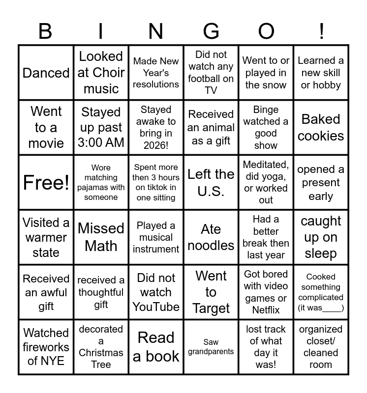 This bingo card has 36 words: Went to Target, Did not watch YouTube, Saw grandparents, Went to a movie, Visited a warmer state, Left the U.S., Stayed up past 3:00 AM, Read a book, Went to or played in the snow, Got bored with video games or Netflix, Baked cookies, Did not watch any football on TV, Cooked something complicated (it was____), Wore matching pajamas with someone, Received an animal as a gift, Danced, Received an awful gift, Meditated, did yoga, or worked out, Free!, Made New Year's resolutions, Spent more then 3 hours on tiktok in one sitting, Missed Math, Ate noodles, Played a musical instrument, Had a better break then last year, Looked at Choir music, Binge watched a good show, decorated a Christmas Tree, Stayed awake to bring in 2026!, Learned a new skill or hobby, organized closet/ cleaned room, Watched fireworks of NYE, caught up on sleep, opened a present early, received a thoughtful gift and lost track of what day it was!.