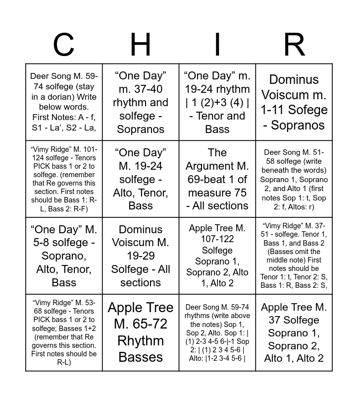 This bingo card has 27 words: Free!, FREE, “One Day” M. 5-8 solfege - Soprano, Alto, Tenor, Bass, “One Day” M. 15-19 solfege - Alto and Baritone (Tenor and Bass), “One Day” M. 19-24 solfege - Alto, Tenor, Bass, “One Day” m. 19-24 rhythm | 1 (2)+3 (4) | - Tenor and Bass, “One Day” m. 37-40 rhythm and solfege - Sopranos, Apple Tree M. 37 Solfege Soprano 1, Soprano 2, Alto 1, Alto 2, Apple Tree M. 65-72 Rhythm Basses, Apple Tree M. 73-88 Solfege Tenor and Bass, Apple Tree M. 107-122 Solfege Soprano 1, Soprano 2, Alto 1, Alto 2, Dominus Voiscum m. 1-11 Sofege - Sopranos, Dominus Voiscum M. 12-18 Solfege - All sections, Dominus Voiscum M. 15-18 Rhythm - Tenors, Dominus Voiscum M. 19-29 Solfege - All sections, Dominus Voiscum M. 21-29 Rhythm - All sections, The Argument M. 69-beat 1 of measure 75 - All sections, Deer Song M. 51-58 solfege (write beneath the words) Soprano 1, Soprano 2, and Alto 1 (first notes Sop 1: t, Sop 2: f, Altos: r), Deer Song M. 51-58 rhythms (write above the notes) Sop 1, Sop 2, Alto, melody Sop 1: | (1) 2-3 (4) 5-6 | Sop 2: | (1) 2 3 (4) 5 6 | Alto: | (1) 2+3 (4) 5+6 | Melody: | 1 2 (3) 4 5 (6) |, Deer Song M. 59- 74 solfege (stay in a dorian) Write below words. First Notes: A - f, S1 - La’, S2 - La,, Deer Song M. 59-74 rhythms (write above the notes) Sop 1, Sop 2, Alto. Sop 1: | (1) 2-3 4-5 6-|-1 Sop 2: | (1) 2 3 4 5-6 | Alto: |1-2 3-4 5-6 |, Deer Song M. 65-79 Solfege and Rhythms. (This section is in e dorian. First solfege for both groups is re), “Vimy Ridge” M. 37-51 - solfege. Tenor 1, Bass 1, and Bass 2 (Basses omit the middle note) First notes should be Tenor 1: t, Tenor 2: S, Bass 1: R, Bass 2: S,, “Vimy Ridge” M. 53-68 solfege - Tenors PICK bass 1 or 2 to solfege; Basses 1+2 (remember that Re governs this section. First notes should be R-L), “Vimy Ridge” M. 69-84 solfege - Tenors PICK bass 1 or 2 to solfege Basses 1+2 (remember that La governs this section. First notes should be R at letter D), “Vimy Ridge” M. 101-124 solfege - Tenors PICK bass 1 or 2 to solfege. (remember that Re governs this section. First notes should be Bass 1: R-L, Bass 2: R-F) and “Vimy Ridge” M. 134-149 solfege Tenors PICK bass 1 or 2 to solfege Basses 1+2 (remember that La governs this section. First notes should be Bass 1: R and Bass 2: S,).
