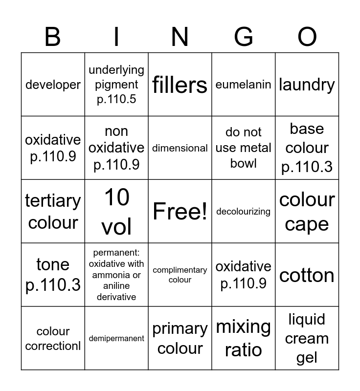 This bingo card has a free space and 24 words: permanent: oxidative with ammonia or aniline derivative, demipermanent, dimensional, colour correctionl, laundry, developer, oxidative p.110.9, underlying pigment p.110.5, decolourizing, complimentary colour, do not use metal bowl, tertiary colour, oxidative p.110.9, cotton, non oxidative p.110.9, mixing ratio, colour cape, fillers, base colour p.110.3, 10 vol, liquid cream gel, tone p.110.3, eumelanin and primary colour.