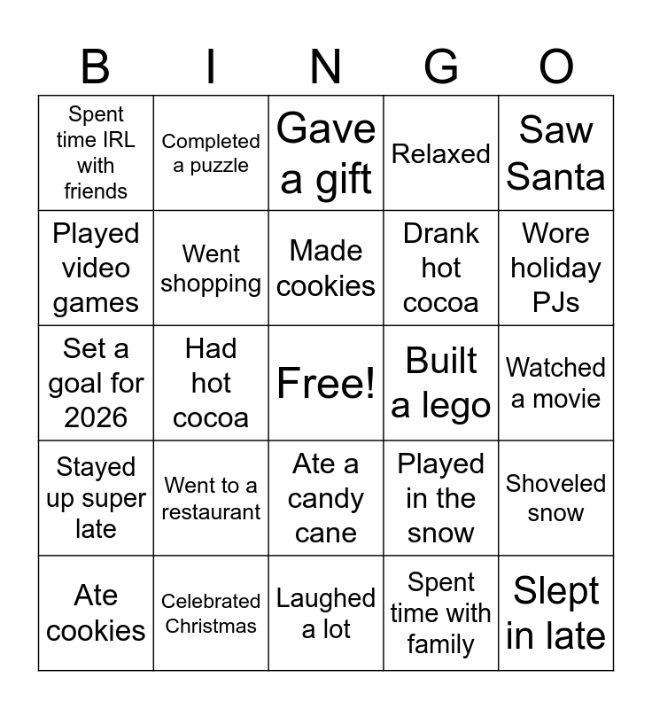 This bingo card has a free space and 24 words: Went to a restaurant, Celebrated Christmas, Made cookies, Ate cookies, Saw Santa, Spent time IRL with friends, Played video games, Completed a puzzle, Built a lego, Ate a candy cane, Drank hot cocoa, Set a goal for 2026, Played in the snow, Shoveled snow, Went shopping, Spent time with family, Watched a movie, Gave a gift, Wore holiday PJs, Had hot cocoa, Slept in late, Stayed up super late, Relaxed and Laughed a lot.