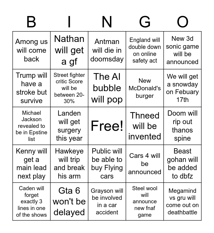 This bingo card has a free space and 24 words: Hawkeye will trip and break his arm, Gta 6 won't be delayed, The AI bubble will pop, Caden will forget exactly 3 lines in one of the shows, New 3d sonic game will be announced, Among us will come back, Trump will have a stroke but survive, Nathan will get a gf, Thneed will be invented, Public will be able to buy Flying cars, New McDonald's burger, Michael Jackson revealed to be in Epstine list, Cars 4 will be announced, Beast gohan will be added to dbfz, Street fighter critic Score will be between 20-30%, Steel wool will announce new fnaf game, Doom will rip out thanos spine, Antman will die in doomsday, We will get a snowday on Febuary 17th, Landen will get surgery this year, Megamind vs gru will come out on deathbattle, Kenny will get a main lead next play, England will double down on online safety act and Grayson will be involved in a car accident.