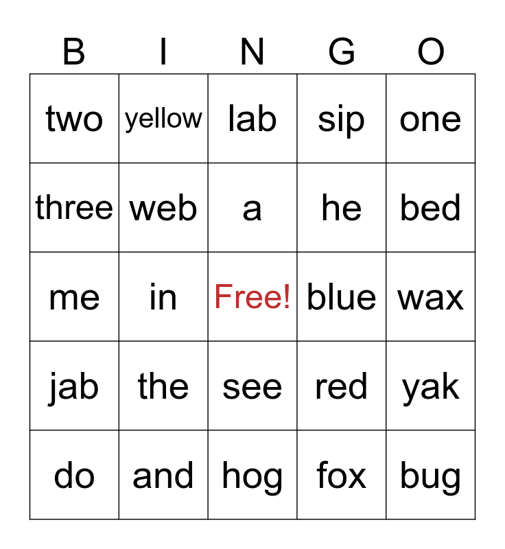 This bingo card has a free space and 24 words: the, and, a, do, one, two, three, yellow, blue, see, he, me, red, yak, web, fox, wax, lab, bed, in, bug, jab, sip and hog.