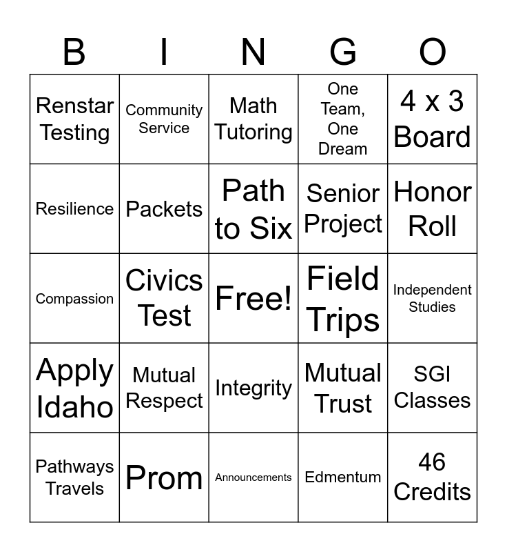 This bingo card has a free space and 24 words: Mutual Respect, Prom, Path to Six, Pathways Travels, 4 x 3 Board, Renstar Testing, Resilience, Community Service, Field Trips, Integrity, Senior Project, Compassion, Mutual Trust, SGI Classes, Packets, Edmentum, Independent Studies, Math Tutoring, Honor Roll, Civics Test, 46 Credits, Apply Idaho, One Team, One Dream and Announcements.