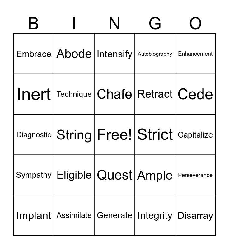 This bingo card has a free space and 24 words: Eligible, Assimilate, Chafe, Implant, Enhancement, Embrace, Inert, Abode, Strict, Quest, Retract, Diagnostic, Ample, Perseverance, Technique, Integrity, Capitalize, Intensify, Cede, String, Disarray, Sympathy, Autobiography and Generate.