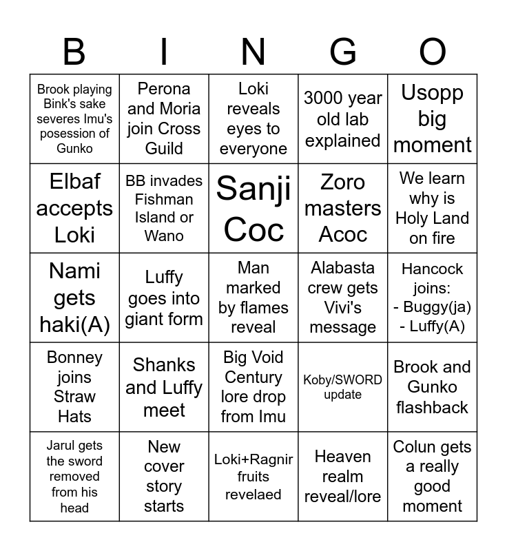 This bingo card has a free space and 24 words: Shanks and Luffy meet, New cover story starts, Sanji Coc, Jarul gets the sword removed from his head, Usopp big moment, Brook playing Bink's sake severes Imu's posession of Gunko, Elbaf accepts Loki, Perona and Moria join Cross Guild, Alabasta crew gets Vivi's message, Big Void Century lore drop from Imu, Zoro masters Acoc, Nami gets haki(A), Koby/SWORD update, Brook and Gunko flashback, BB invades Fishman Island or Wano, Heaven realm reveal/lore, Hancock joins: - Buggy(ja) - Luffy(A), Loki reveals eyes to everyone, We learn why is Holy Land on fire, Luffy goes into giant form, Colun gets a really good moment, Bonney joins Straw Hats, 3000 year old lab explained and Loki+Ragnir fruits revelaed.