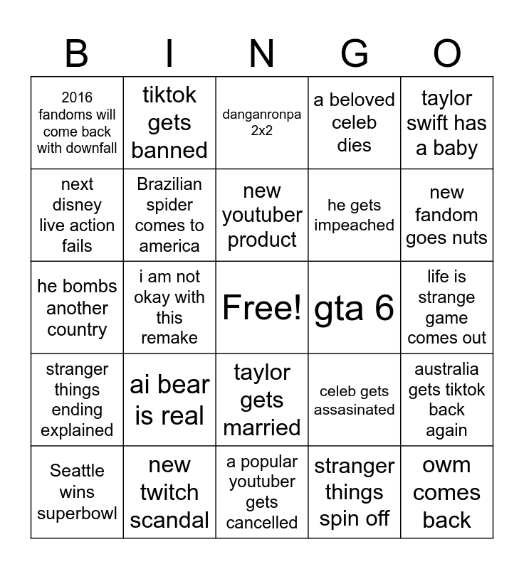 This bingo card has a free space and 24 words: ai bear is real, new twitch scandal, new youtuber product, Seattle wins superbowl, taylor swift has a baby, 2016 fandoms will come back with downfall, next disney live action fails, tiktok gets banned, gta 6, taylor gets married, he gets impeached, he bombs another country, celeb gets assasinated, australia gets tiktok back again, Brazilian spider comes to america, stranger things spin off, life is strange game comes out, danganronpa 2x2, new fandom goes nuts, i am not okay with this remake, owm comes back, stranger things ending explained, a beloved celeb dies and a popular youtuber gets cancelled.