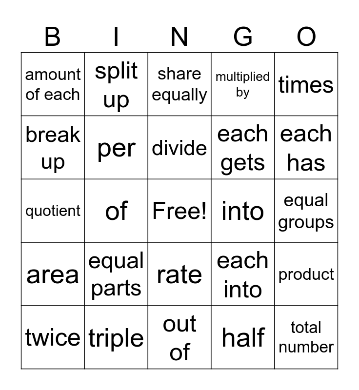 This bingo card has a free space and 24 words: twice, equal parts, divide, half, times, amount of each, split up, share equally, into, equal groups, quotient, per, each into, product, break up, triple, out of, multiplied by, each has, area, of, rate, each gets and total number.
