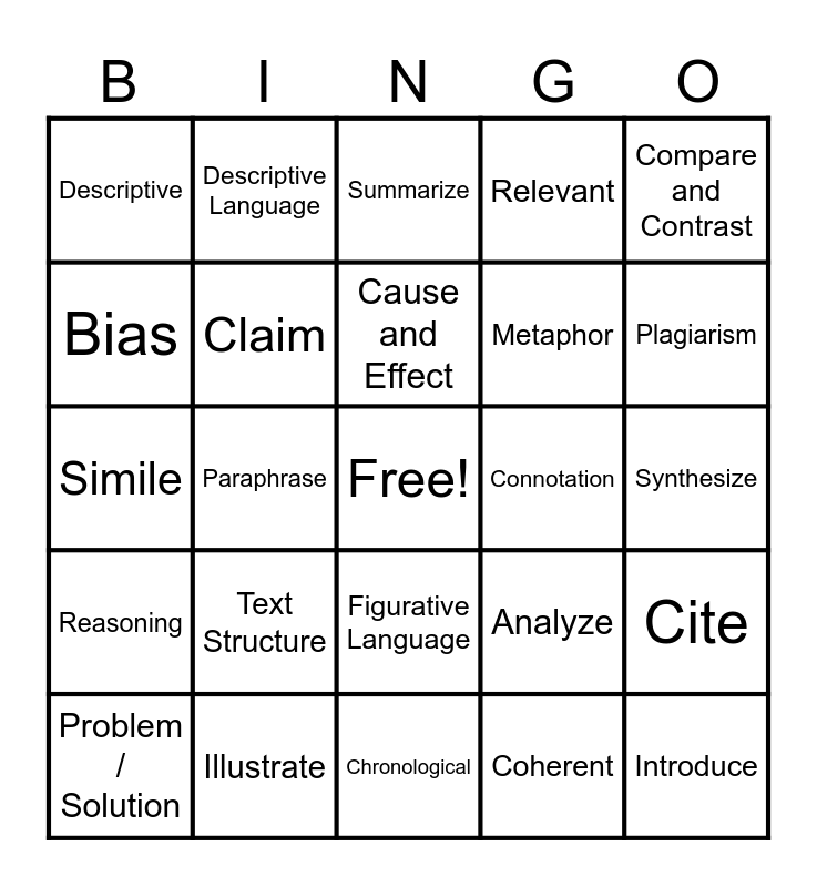 This bingo card has a free space and 25 words: Text Structure, Chronological, Cause and Effect, Problem / Solution, Compare and Contrast, Descriptive, Bias, Descriptive Language, Connotation, Figurative Language, Metaphor, Simile, Analyze, Cite, Claim, Clarify, Synthesize, Summarize, Plagiarism, Paraphrase, Introduce, Illustrate, Reasoning, Relevant and Coherent.