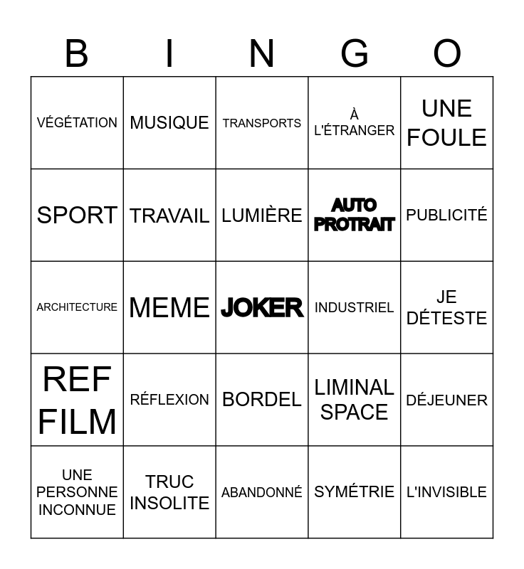 This bingo card has a free space and 24 words: RÉFLEXION, TRUC INSOLITE, LUMIÈRE, UNE PERSONNE INCONNUE, UNE FOULE, VÉGÉTATION, SPORT, MUSIQUE, INDUSTRIEL, BORDEL, AUTO PROTRAIT, ARCHITECTURE, LIMINAL SPACE, DÉJEUNER, TRAVAIL, SYMÉTRIE, JE DÉTESTE, TRANSPORTS, PUBLICITÉ, MEME, L'INVISIBLE, REF FILM, À L'ÉTRANGER and ABANDONNÉ.