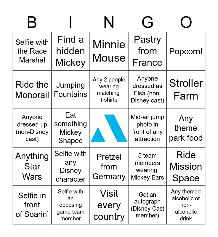 This bingo card has a free space and 24 words: Selfie with any Disney character, Selfie with an opposing game team member, Any 2 people wearing matching t-shirts, Selfie in front of Soarin’, Popcorn!, Selfie with the Race Marshal, Ride the Monorail, Find a hidden Mickey, Mid-air jump photo in front of any attraction, Pretzel from Germany, Anyone dressed as Elsa (non- Disney cast), Anyone dressed up (non-Disney cast), 5 team members wearing Mickey Ears, Ride Mission Space, Jumping Fountains, Get an autograph (Disney Cast member), Any theme park food, Minnie Mouse, Stroller Farm, Eat something Mickey Shaped, Any themed alcoholic or non-alcoholic drink, Anything Star Wars, Pastry from France and Visit every country.