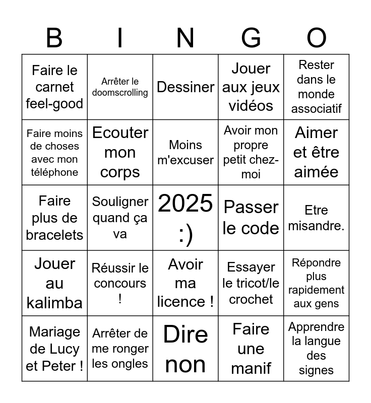 This bingo card has a free space and 24 words: Réussir le concours !, Arrêter de me ronger les ongles, Moins m'excuser, Mariage de Lucy et Peter !, Rester dans le monde associatif, Faire le carnet feel-good, Faire moins de choses avec mon téléphone, Arrêter le doomscrolling, Passer le code, Avoir ma licence !, Avoir mon propre petit chez-moi, Faire plus de bracelets, Essayer le tricot/le crochet, Répondre plus rapidement aux gens, Ecouter mon corps, Faire une manif, Etre misandre., Dessiner, Aimer et être aimée, Souligner quand ça va, Apprendre la langue des signes, Jouer au kalimba, Jouer aux jeux vidéos and Dire non.