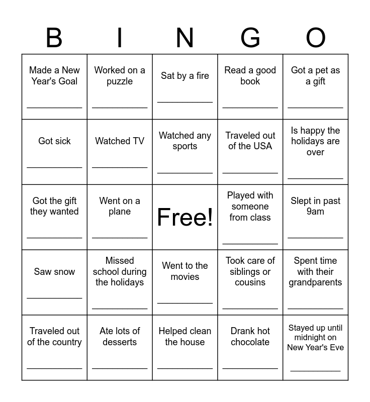 This bingo card has a free space and 24 words: Missed school during the holidays ___________, Ate lots of desserts ___________, Watched any sports ___________, Traveled out of the country ___________, Got a pet as a gift ___________, Made a New Year's Goal ___________, Got sick ___________, Worked on a puzzle ___________, Played with someone from class ___________, Went to the movies ___________, Traveled out of the USA ___________, Got the gift they wanted ___________, Took care of siblings or cousins ___________, Spent time with their grandparents ___________, Watched TV ___________, Drank hot chocolate ___________, Slept in past 9am ___________, Sat by a fire ___________, Is happy the holidays are over ___________, Went on a plane ___________, Stayed up until midnight on New Year's Eve ___________, Saw snow ___________, Read a good book ___________ and Helped clean the house ___________.