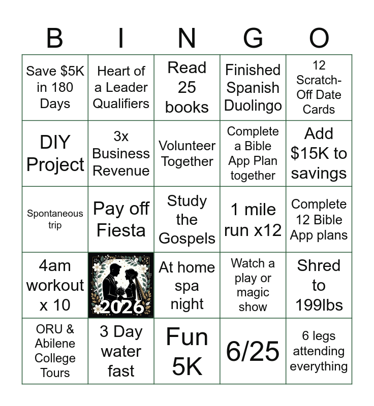 This bingo card has 1 images and 24 words: Fun 5K, Volunteer Together, ORU & Abilene College Tours, 12 Scratch-Off Date Cards, Save $5K in 180 Days, DIY Project, Heart of a Leader Qualifiers, 1 mile run x12, At home spa night, Complete a Bible App Plan together, Spontaneous trip, Watch a play or magic show, Shred to 199lbs, 3x Business Revenue, 6 legs attending everything, Complete 12 Bible App plans, Read 25 books, Add $15K to savings, Pay off Fiesta, Study the Gospels, 3 Day water fast, 4am workout x 10, Finished Spanish Duolingo and 6/25.