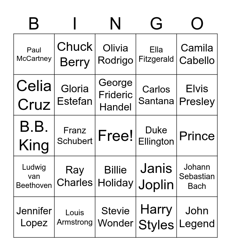 This bingo card has a free space and 44 words: Bruno Mars, John Legend, Justin Bieber, Jennifer Lopez, Shakira, Harry Styles, Olivia Rodrigo, Ed Sheeran, Camila Cabello, Louis Armstrong, Ella Fitzgerald, Duke Ellington, Billie Holiday, Ray Charles, Aretha Franklin, Stevie Wonder, Nat King Cole, B.B. King, James Brown, Elvis Presley, Chuck Berry, Little Richard, Bob Dylan, Paul McCartney, Michael Jackson, Prince, David Bowie, Jimi Hendrix, Janis Joplin, Ludwig van Beethoven, Wolfgang Amadeus Mozart, Johann Sebastian Bach, Pyotr Ilyich Tchaikovsky, Antonio Vivaldi, Franz Schubert, Clara Schumann, Yo-Yo Ma, Igor Stravinsky, George Frideric Handel, Celia Cruz, Carlos Santana, Ravi Shankar, Gloria Estefan and Fela Kuti.