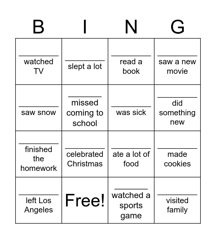 This bingo card has 25 words: _________ went to the park, _________ went to the doctor, _________ did something new, _______ traveled outside California, _________ saw snow, _________ watched TV, _______ missed coming to school, _________ slept a lot, Free!, _________ visited friends, _________ finished the homework, _________ ate a lot of food, ______ celebrated the New Year, _________ was bored, _________ was sick, _________ left the country, _______ watched a sports game, _________ read a book, _________ celebrated Christmas, _________ made cookies, _________ left Los Angeles, _________ helped their parents, _________ visited family, _________ saw a new movie and _________ hosted a party.