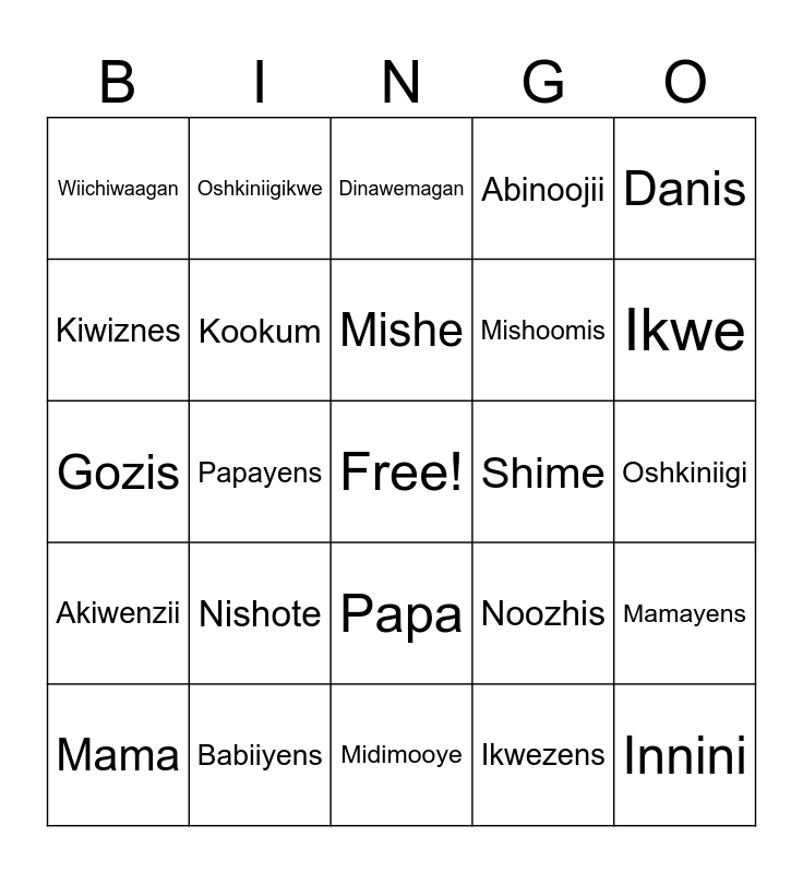 This bingo card has a free space and 24 words: Nishote, Babiiyens, Mishe, Mama, Danis, Wiichiwaagan, Kiwiznes, Oshkiniigikwe, Shime, Papa, Mishoomis, Gozis, Noozhis, Mamayens, Kookum, Ikwezens, Oshkiniigi, Dinawemagan, Ikwe, Papayens, Innini, Akiwenzii, Abinoojii and Midimooye.