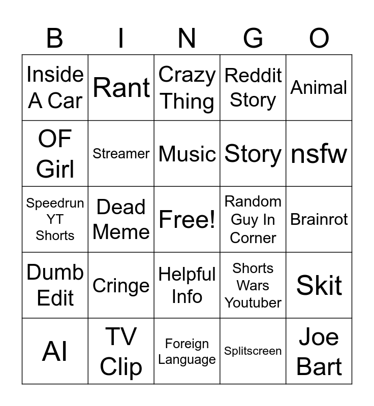 This bingo card has a free space and 24 words: Cringe, TV Clip, Music, AI, Animal, Inside A Car, OF Girl, Rant, Random Guy In Corner, Helpful Info, Story, Speedrun YT Shorts, Shorts Wars Youtuber, Skit, Streamer, Splitscreen, Brainrot, Crazy Thing, nsfw, Dead Meme, Joe Bart, Dumb Edit, Reddit Story and Foreign Language.