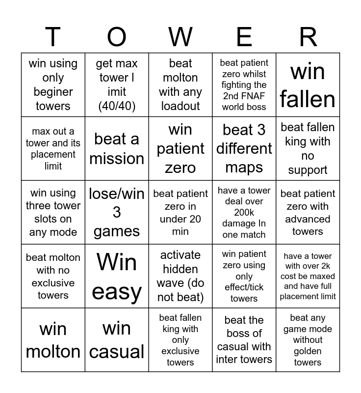 This bingo card has a free space and 24 words: Win easy, win casual, win patient zero, win molton, win fallen, win using only beginer towers, max out a tower and its placement limit, get max tower limit (40/40), have a tower deal over 200k damage In one match, activate hidden wave (do not beat), beat 3 different maps, win using three tower slots on any mode, win patient zero using only effect/tick towers, have a tower with over 2k cost be maxed and have full placement limit, beat a mission, beat the boss of casual with inter towers, beat patient zero with advanced towers, beat molton with any loadout, beat fallen king with no support, lose/win 3 games, beat any game mode without golden towers, beat molton with no exclusive towers, beat patient zero whilst fighting the 2nd FNAF world boss and beat fallen king with only exclusive towers.