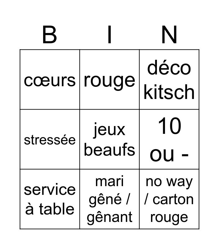 This bingo card has a free space and 8 words: 10 ou -, déco kitsch, rouge, service à table, cœurs, no way / carton rouge, stressée and mari gêné / gênant.