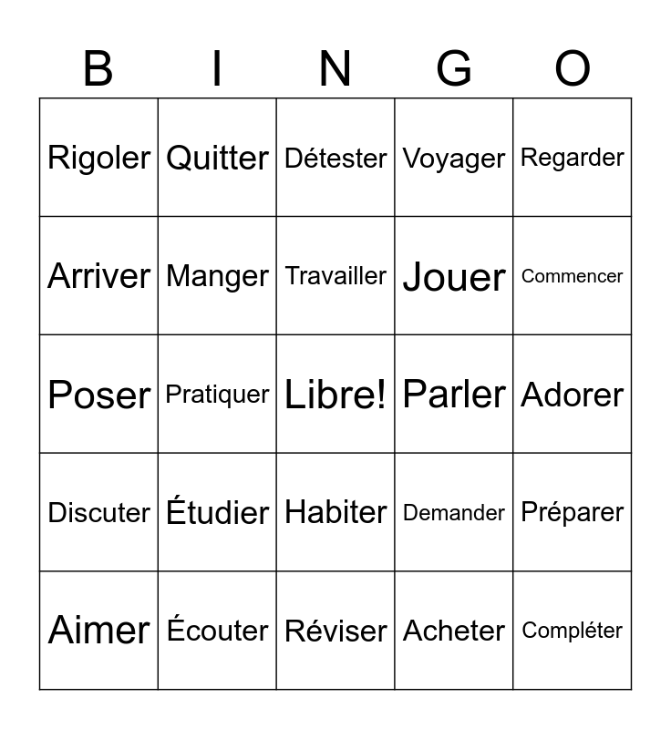 This bingo card has a free space and 24 words: Étudier, Écouter, Travailler, Aimer, Regarder, Rigoler, Arriver, Quitter, Parler, Habiter, Jouer, Poser, Demander, Préparer, Manger, Acheter, Adorer, Détester, Commencer, Pratiquer, Compléter, Discuter, Voyager and Réviser.
