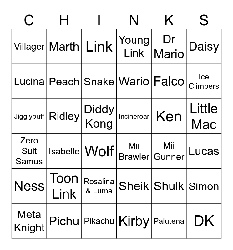 This bingo card has 75 words: Mario, DK, Link, Samus, Dark Samus, Yoshi, Kirby, Fox, Pikachu, Luigi, Ness, Captain Falcon, Peach, Daisy, Bowser, Ice Climbers, Sheik, Jigglypuff, Zelda, Dr Mario, Pichu, Falco, Lucina, Marth, Young Link, Ganondorf, Mewtew, Roy, Chrom, Mr Game & Watch, Meta Knight, Pit, Dark Pit, Zero Suit Samus, Wario, Snake, Ike, Pokemon Trainer, Diddy Kong, Lucas, Sonic, King Dedede, Olimar, Lucario, R.O.B., Toon Link, Wolf, Villager, Mega Man, Wii Fit Trainer, Rosalina & Luma, Little Mac, Greninja, Palutena, Pac-Man, Robin, Shulk, Bowser Jr., Duck Hunt, Ryu, Ken, Cloud, Corrin, Bayonetta, Inkling, Ridley, Simon, Richter, King K. Rool, Isabelle, Incineroar, Mii Brawler, Mii Swordfighter, Mii Gunner and Random.