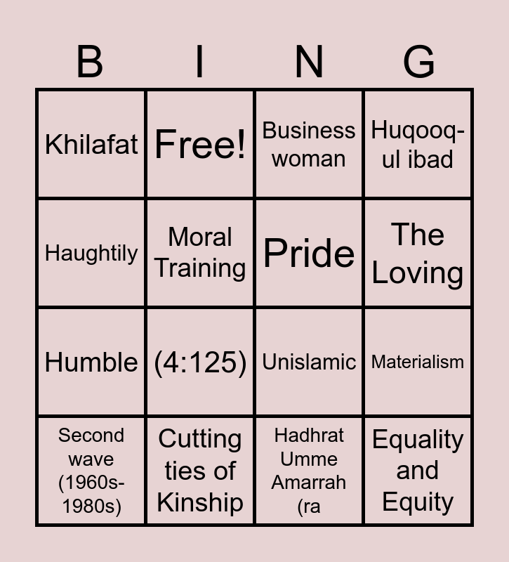 This bingo card has 19 words: Unislamic, Paradise, Business woman, Equality and Equity, Materialism, Haughtily, Hadhrat Umme Amarrah (ra, Khilafat, Free!, Humble, (4:125), Moral Training, Pride, Cutting ties of Kinship, Second wave (1960s-1980s), Waqfe Jadid, Huqooq-ul ibad, The Loving and Deeds are judged by emotions.