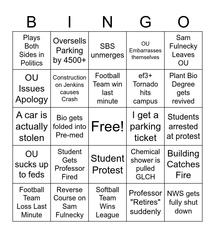 This bingo card has a free space and 24 words: Student Gets Professor Fired, Reverse Course on Sam Fulnecky, Football Team win last minute, Football Team Loss Last Minute, Sam Fulnecky Leaves OU, Plays Both Sides in Politics, OU Issues Apology, Oversells Parking by 4500+, I get a parking ticket, Student Protest, ef3+ Tornado hits campus, A car is actually stolen, Chemical shower is pulled GLCH, Building Catches Fire, Construction on Jenkins causes Crash, Professor "Retires" suddenly, Students arrested at protest, SBS unmerges, Plant Bio Degree gets revived, Bio gets folded into Pre-med, NWS gets fully shut down, OU sucks up to feds, OU Embarrasses themselves and Softball Team Wins League.