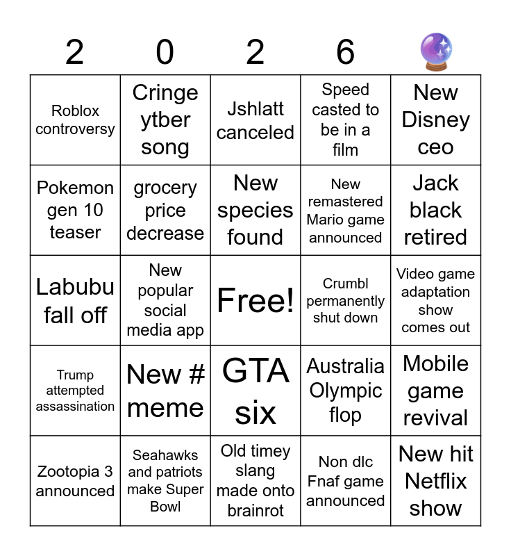 This bingo card has a free space and 24 words: New # meme, Seahawks and patriots make Super Bowl, New species found, Zootopia 3 announced, New Disney ceo, Roblox controversy, Pokemon gen 10 teaser, Cringe ytber song, Crumbl permanently shut down, GTA six, New remastered Mario game announced, Labubu fall off, Australia Olympic flop, Mobile game revival, grocery price decrease, Non dlc Fnaf game announced, Video game adaptation show comes out, Jshlatt canceled, Jack black retired, New popular social media app, New hit Netflix show, Trump attempted assassination, Speed casted to be in a film and Old timey slang made onto brainrot.