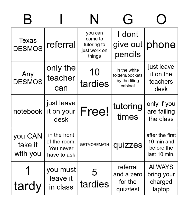 This bingo card has a free space and 25 words: in the front of the room. You never have to ask, 5 tardies, 10 tardies, 1 tardy, phone, Texas DESMOS, Any DESMOS, referral, tutoring times, GETMOREMATH, in the white folders/pockets by the filing cabinet, notebook, quizzes, after the first 10 min and before the last 10 min., only the teacher can, anyone can, only if you are failing the class, you can come to tutoring to just work on things, just leave it on the teachers desk, just leave it on your desk, ALWAYS bring your charged laptop, you must leave it in class, you CAN take it with you, I dont give out pencils and referral and a zero for the quiz/test.