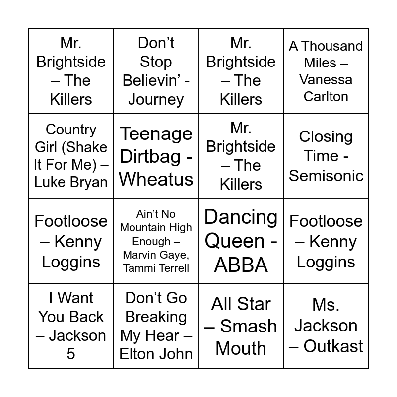 ⚠ This card has duplicate items: Sweet Caroline – Neil Diamond (3), Dancing Queen - ABBA (3), Mr. Brightside – The Killers (3), Don’t Stop Believin’ - Journey (3), A Thousand Miles – Vanessa Carlton (3), Just the Way You Are – Bruno Mars (3), Love Story – Taylor Swift (3), Party In The U.S.A – Miley Cyrus (3), Sweet Home Alabama – Lynyrd Skynyrd (3), I Love Rock ‘N Roll – Joan Jett & the Blackhearts (3), Jessie’s Girl – Rick Springfield (3), Semi-Charmed Life – Third Eye Blind (3), Closing Time - Semisonic (3), Teenage Dirtbag - Wheatus (3), Footloose – Kenny Loggins (3), Livin’ On a Prayer – Bon Jovi (3), I Want You Back – Jackson 5 (3), All Star – Smash Mouth (3), Country Girl (Shake It For Me) – Luke Bryan (3), Ain’t No Mountain High Enough – Marvin Gaye, Tammi Terrell (2), Don’t Go Breaking My Hear – Elton John (2), Love Song – Sara Bareilles (2), I Want It That Way – Backstreet Boys (2), Y.M.C.A. – The Village People (2)