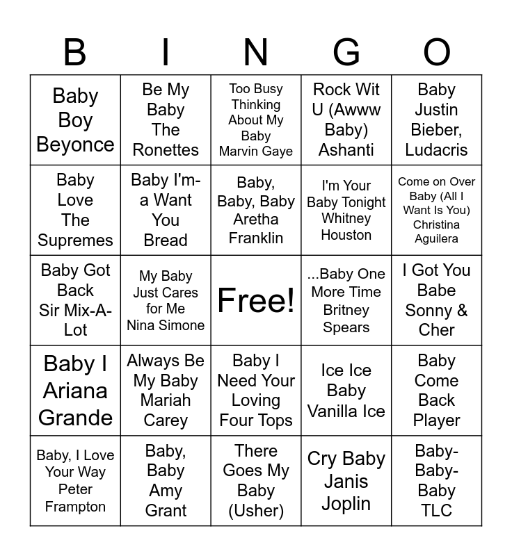 This bingo card has a free space and 24 words: Always Be My Baby Mariah Carey, Baby, Baby Amy Grant, Baby, Baby, Baby Aretha Franklin, Baby, I Love Your Way Peter Frampton, Baby Justin Bieber, Ludacris, Baby Boy Beyonce, Baby Love The Supremes, Be My Baby The Ronettes, ...Baby One More Time Britney Spears, Baby I Need Your Loving Four Tops, I'm Your Baby Tonight Whitney Houston, Baby Got Back Sir Mix-A-Lot, Ice Ice Baby Vanilla Ice, Baby Come Back Player, Baby I'm-a Want You Bread, Cry Baby Janis Joplin, I Got You Babe Sonny & Cher, Too Busy Thinking About My Baby Marvin Gaye, Come on Over Baby (All I Want Is You) Christina Aguilera, My Baby Just Cares for Me Nina Simone, Baby-Baby-Baby TLC, Baby I Ariana Grande, Rock Wit U (Awww Baby) Ashanti and There Goes My Baby (Usher).