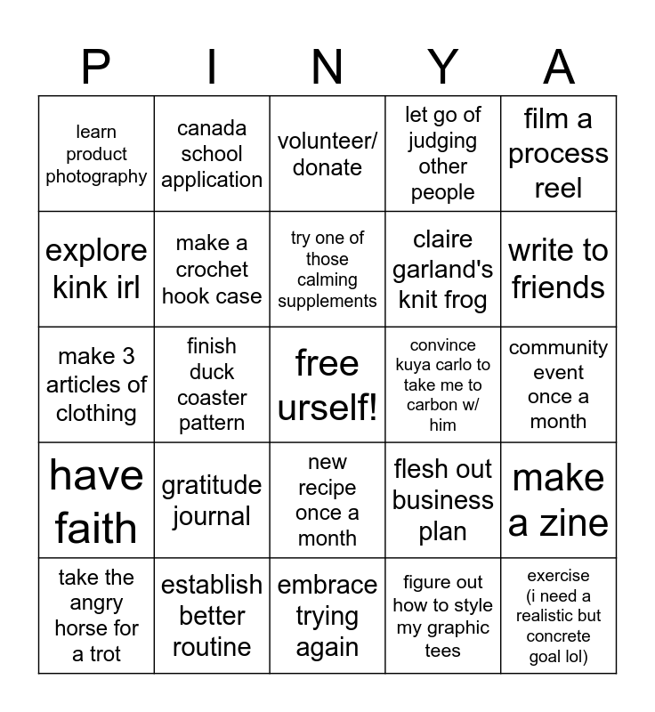 This bingo card has a free space and 24 words: gratitude journal, establish better routine, try one of those calming supplements, take the angry horse for a trot, film a process reel, learn product photography, explore kink irl, canada school application, convince kuya carlo to take me to carbon w/ him, new recipe once a month, claire garland's knit frog, make 3 articles of clothing, flesh out business plan, make a zine, make a crochet hook case, figure out how to style my graphic tees, community event once a month, volunteer/ donate, write to friends, finish duck coaster pattern, exercise (i need a realistic but concrete goal lol), have faith, let go of judging other people and embrace trying again.