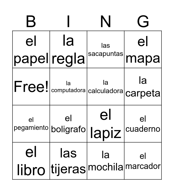 This bingo card has 16 words: las tijeras, el cuaderno, las sacapuntas, el papel, el pegamiento, la regla, el lapiz, la mochila, Free!, la computadora, el libro, el mapa, el boligrafo, la carpeta, la calculadora and el marcador.