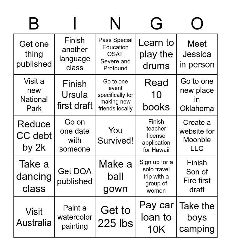 This bingo card has a free space and 24 words: Get DOA published, Paint a watercolor painting, Go to one event specifically for making new friends locally, Visit Australia, Meet Jessica in person, Get one thing published, Visit a new National Park, Finish another language class, Finish teacher license application for Hawaii, Make a ball gown, Read 10 books, Reduce CC debt by 2k, Sign up for a solo travel trip with a group of women, Finish Son of Fire first draft, Finish Ursula first draft, Pay car loan to 10K, Create a website for Moonbie LLC, Pass Special Education OSAT: Severe and Profound, Go to one new place in Oklahoma, Go on one date with someone, Take the boys camping, Take a dancing class, Learn to play the drums and Get to 225 lbs.
