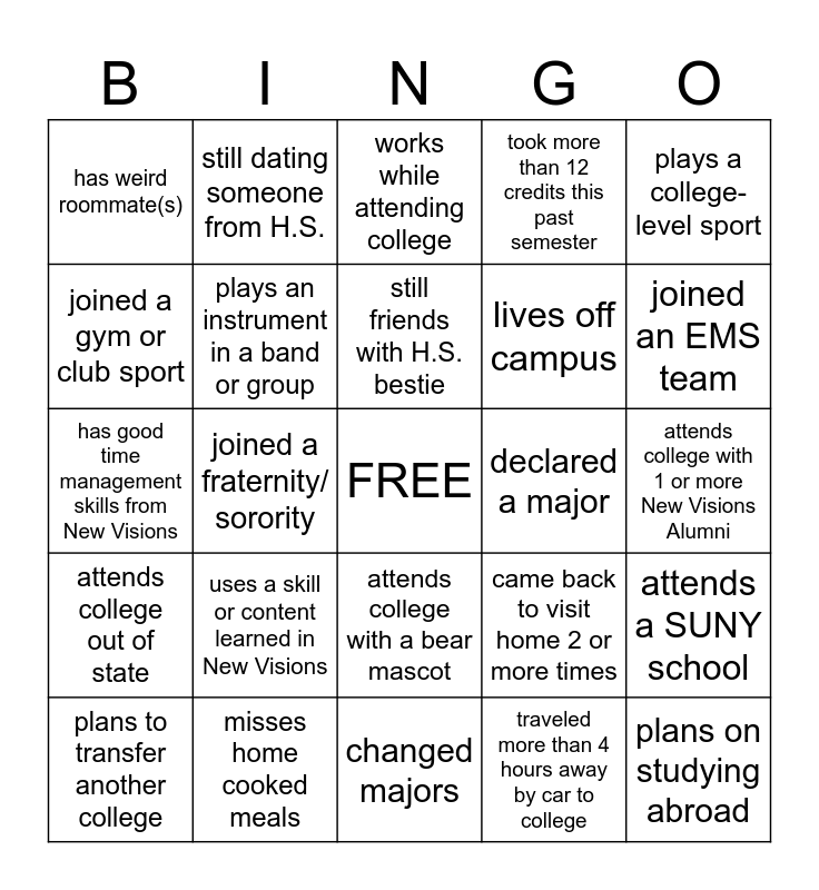 This bingo card has a free space and 24 words: uses a skill or content learned in New Visions, misses home cooked meals, still friends with H.S. bestie, plans to transfer another college, plays a college-level sport, has weird roommate(s), joined a gym or club sport, still dating someone from H.S., declared a major, attends college with a bear mascot, lives off campus, has good time management skills from New Visions, came back to visit home 2 or more times, attends a SUNY school, plays an instrument in a band or group, traveled more than 4 hours away by car to college, attends college with 1 or more New Visions Alumni, works while attending college, joined an EMS team, joined a fraternity/ sorority, plans on studying abroad, attends college out of state, took more than 12 credits this past semester and changed majors.