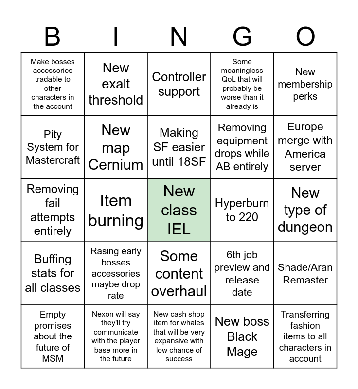 This bingo card has a free space and 24 words: Rasing early bosses accessories maybe drop rate, Nexon will say they'll try communicate with the player base more in the future, Making SF easier until 18SF, Empty promises about the future of MSM, New membership perks, Make bosses accessories tradable to other characters in the account, Pity System for Mastercraft, New exalt threshold, Hyperburn to 220, Some content overhaul, Removing equipment drops while AB entirely, Removing fail attempts entirely, 6th job preview and release date, Shade/Aran Remaster, New map Cernium, New boss Black Mage, New type of dungeon, Controller support, Europe merge with America server, Item burning, Transferring fashion items to all characters in account, Buffing stats for all classes, Some meaningless QoL that will probably be worse than it already is and New cash shop item for whales that will be very expansive with low chance of success.
